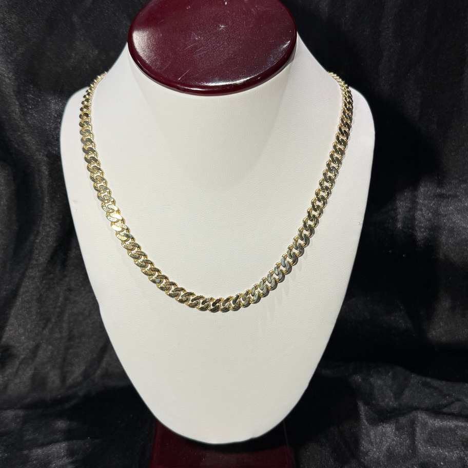 10k gold cuban link chain with white gold diamond-cuts (No stones, light weight). Reversible: Plain on the other side. Approx. 24”long & approx. 7mm wide. No returns or refunds.